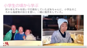 次の写真では、南谷先生ご自身が軽自動車の荷台で販売する姿が映されます。十七歳で朝市に店を持ち、十八歳で免許を取ってからは祖母の“運転手”として能登を回り、朝市と行商を両輪に震災まで続けてきたという話が続きました。朝市の写真では姑さん、実のお母さま、そして後を継いだ娘さんの姿も紹介され、「家族みんなで助けてもらって商売ができている」という言葉が印象に残ります。